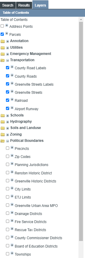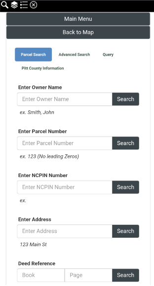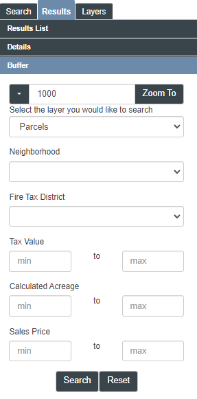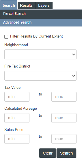 The Webviewer's primary focus is looking up parcel information, so the Advanced search panel is targeted to look for parcels using some of the other fields in our GIS System.