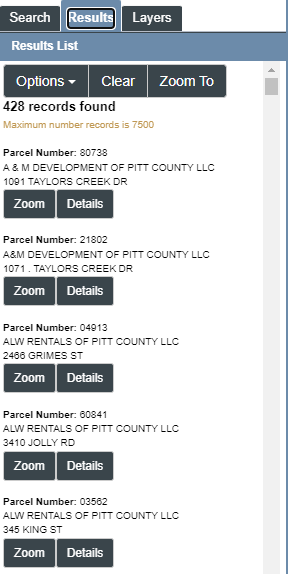 Clicking on the Clear Button, clears all selected features and graphics on the map and also removes any search results that you may have in the Results window.